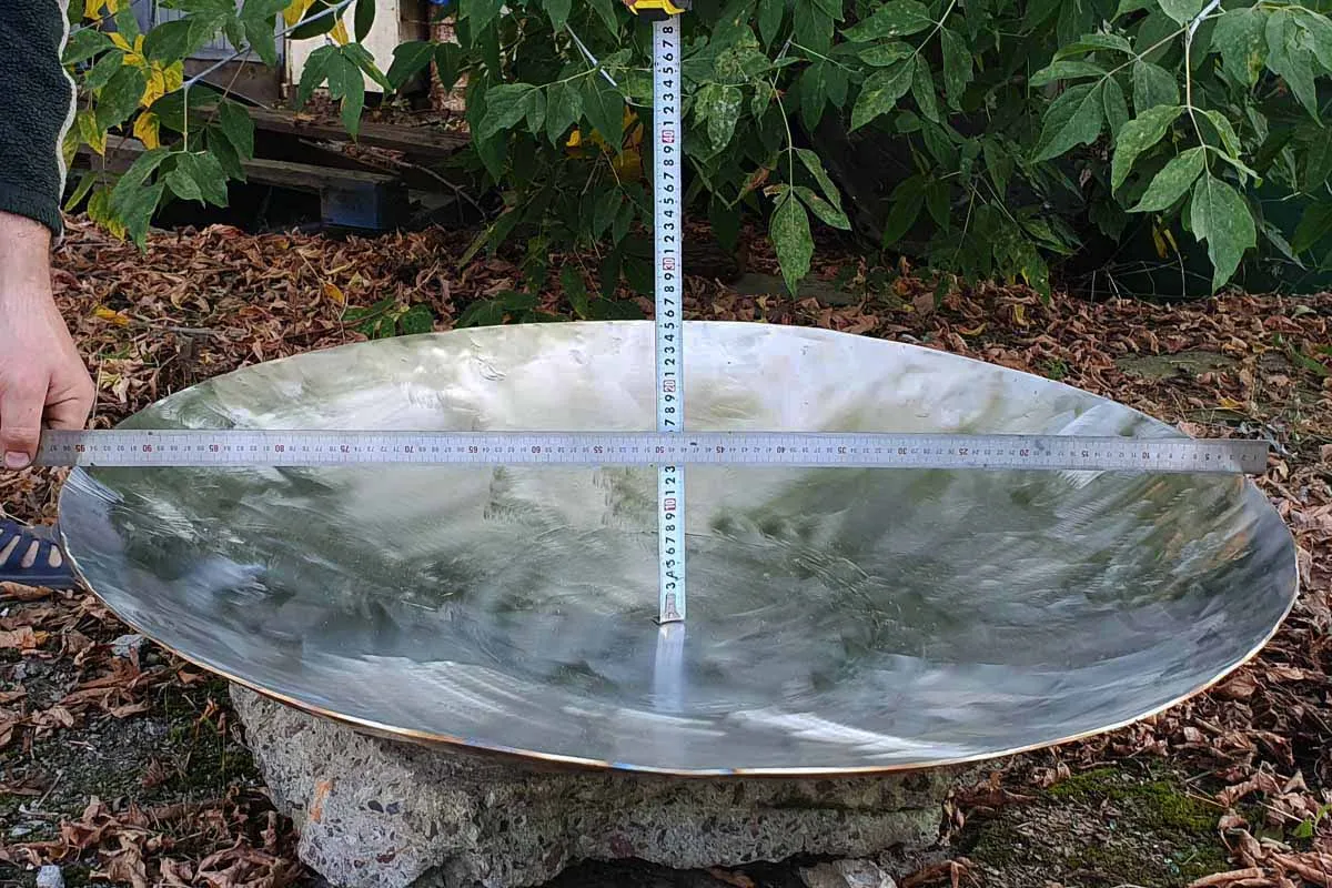 Диаметр костровой чаши 96 сантиметра, глубина чаши 10 сантиметров, толщина метала 3 миллиметра. Материал изготовления - нержавеющая сталь марки AISI 304